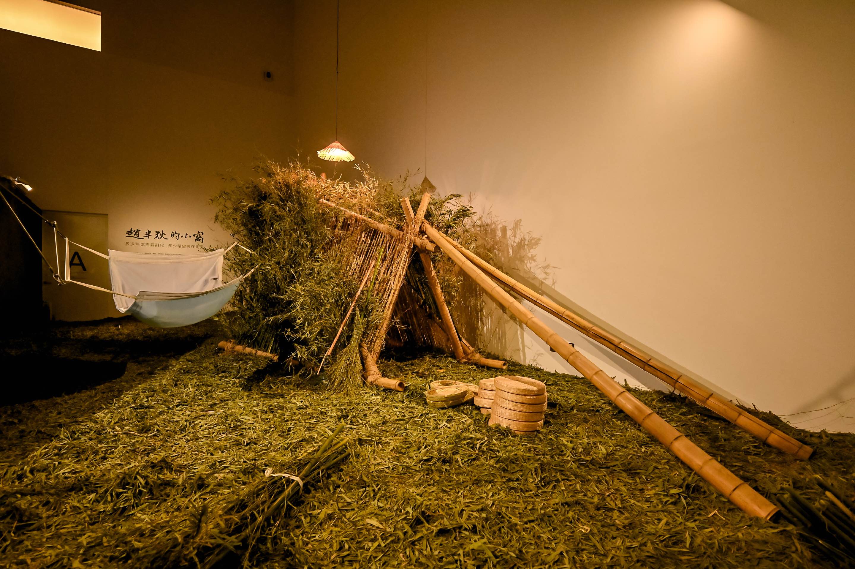 “Zhao Bandi’s Hut” consists of a bamboo shack, a bamboo leaf lawn, a hammock, and small paintings inside the shack. The hut is like a shelter on a deserted island in a flood where the artist spent the rest of his life, comforting himself and each visitor. People can rest in the hammock or sit around the lawn to chat. In the shack is Zhao’s privacy: small paintings he created based on inspirations, which are replaced frequently.