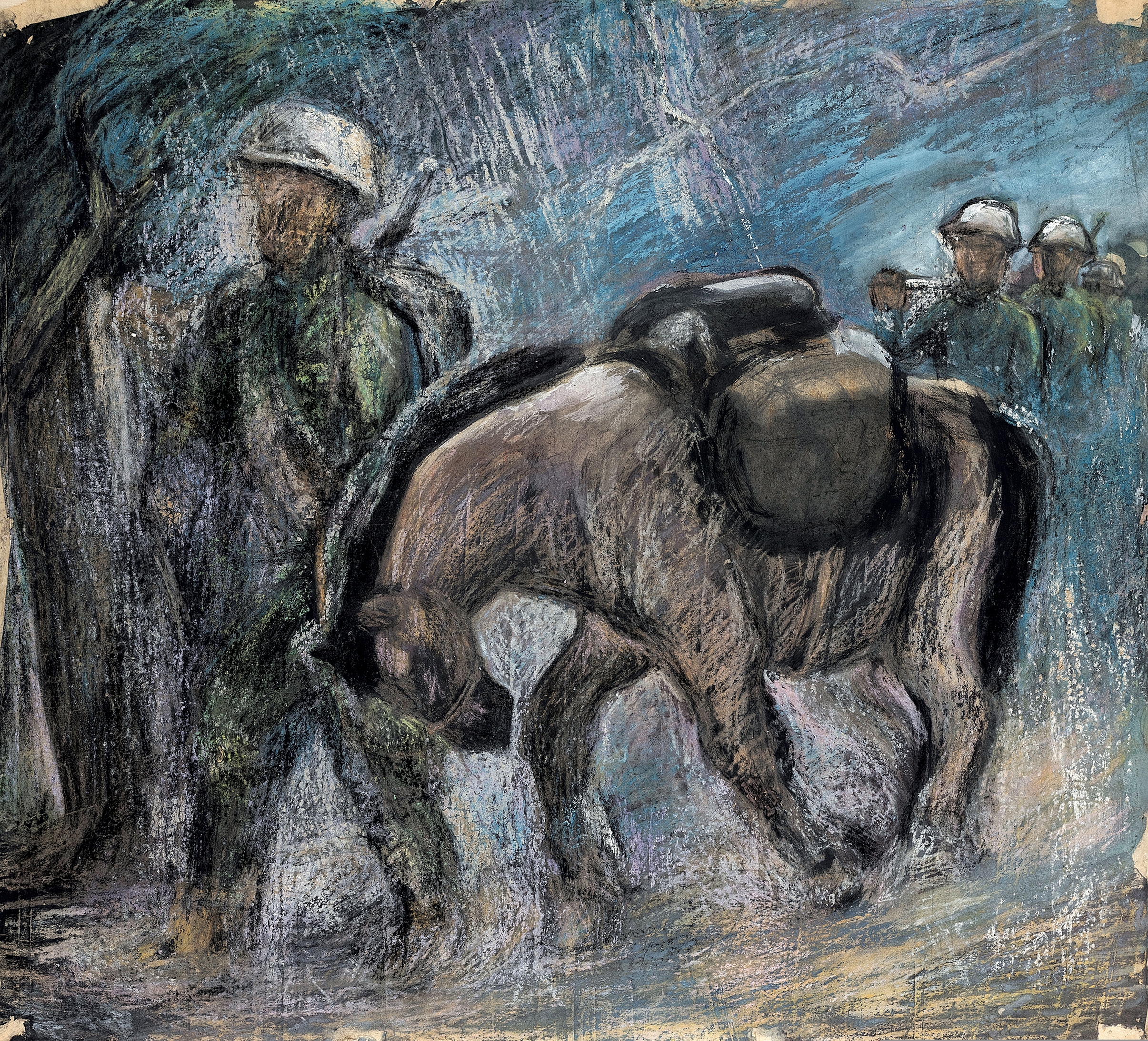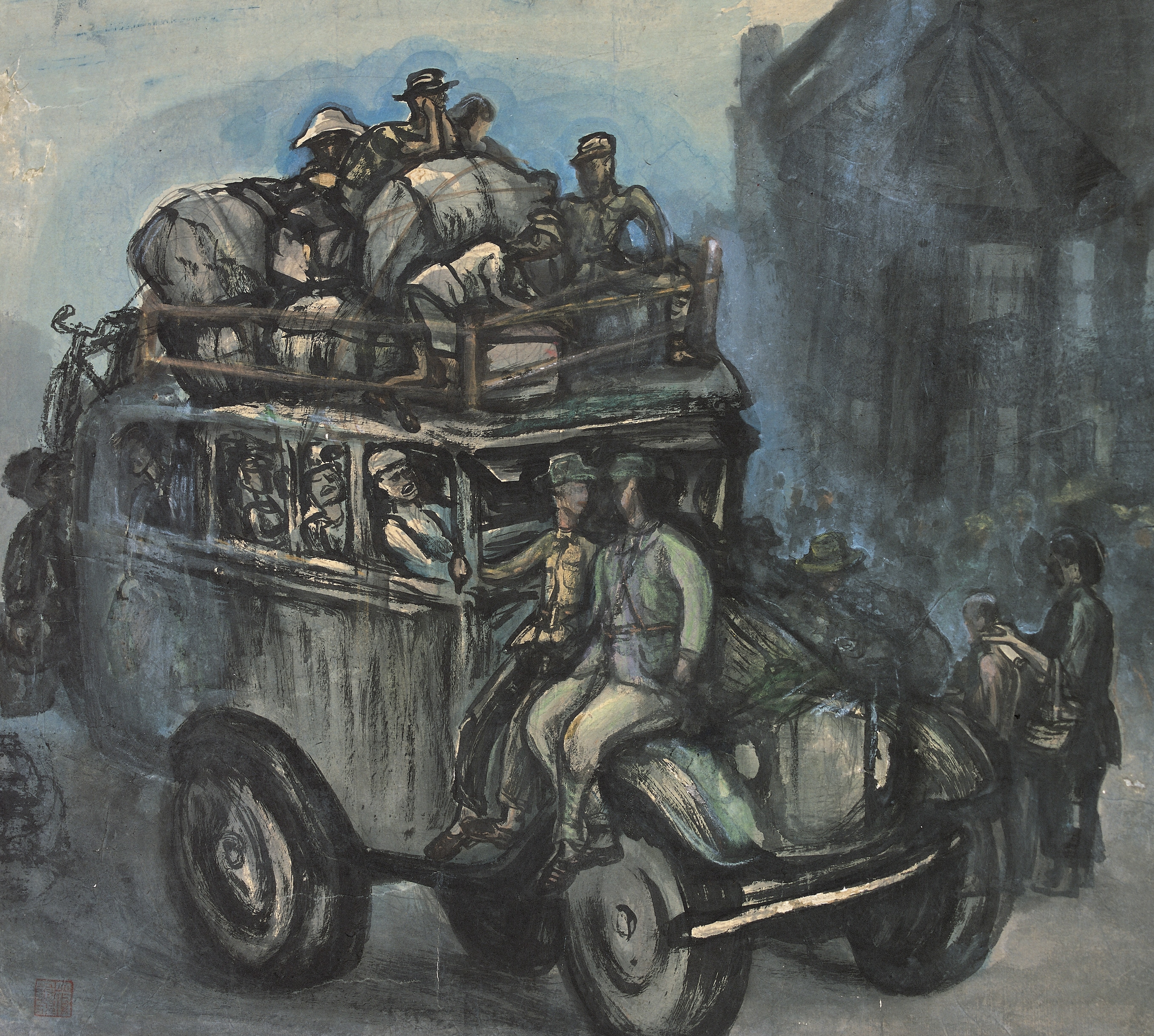 The artist Huang Xinbo once remarked that Fu’s paintings “make one tremble, make one indignant, and at the same time reveal beautiful rainbows amidst shades of grey.” In the early years of the People’s Republic, some jokingly likened his style to “a plate of chili-fried beef”: robust, fiery, and direct to the heart. In 1946, Fu Luofei was elected the first president of the Human Art Club in Hong Kong, a group that, together with its wider circle, brought together some of the most outstanding left-wing artists active in the Nationalist-controlled regions during the war years. Among them were Huang Xinbo, Zhang Guangyu, Ye Qianyu, Pang Xunqin, Liao Bingxiong, Xie Qusheng, Li Hua, Ye Fu, and Huang Yongyu—artists whose practices matured through the experience of the War of Resistance and who collectively helped sustain the backbone of wartime Chinese art.
