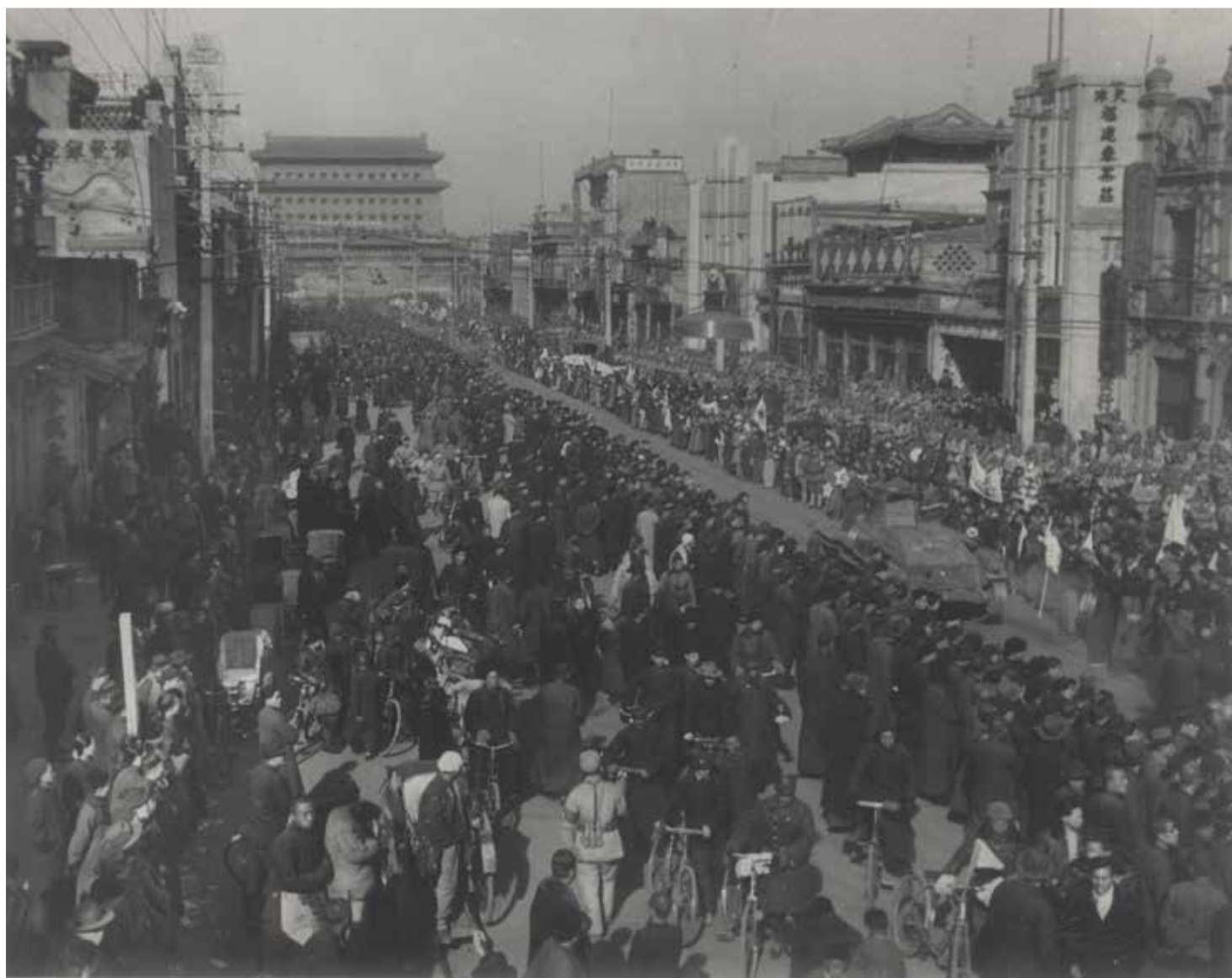 1949年1月22日傅作义在《北平和平解决问题的协议书》上签字并发表广播讲话。1月31日协议生效,北平宣告和平解放,因为时值春节的原因,中国人民解放军定于2月3日进入北平接管防务。2月3日上午10 时,入城式开始。参加入城式的部队从永定门入城,工人、市民、学生和各界人群挤满了全城各条通衢大道,前门大街人山人海,平津总前委、北平市委、军管会以及北平联合办事处傅作义方面的代表登上正阳门箭楼,检阅了入城部队。参加北平入城式采访的摄影记者有高帆、高粮、杨振亚、孟昭瑞、李夫培、孙丕永、张祖道。